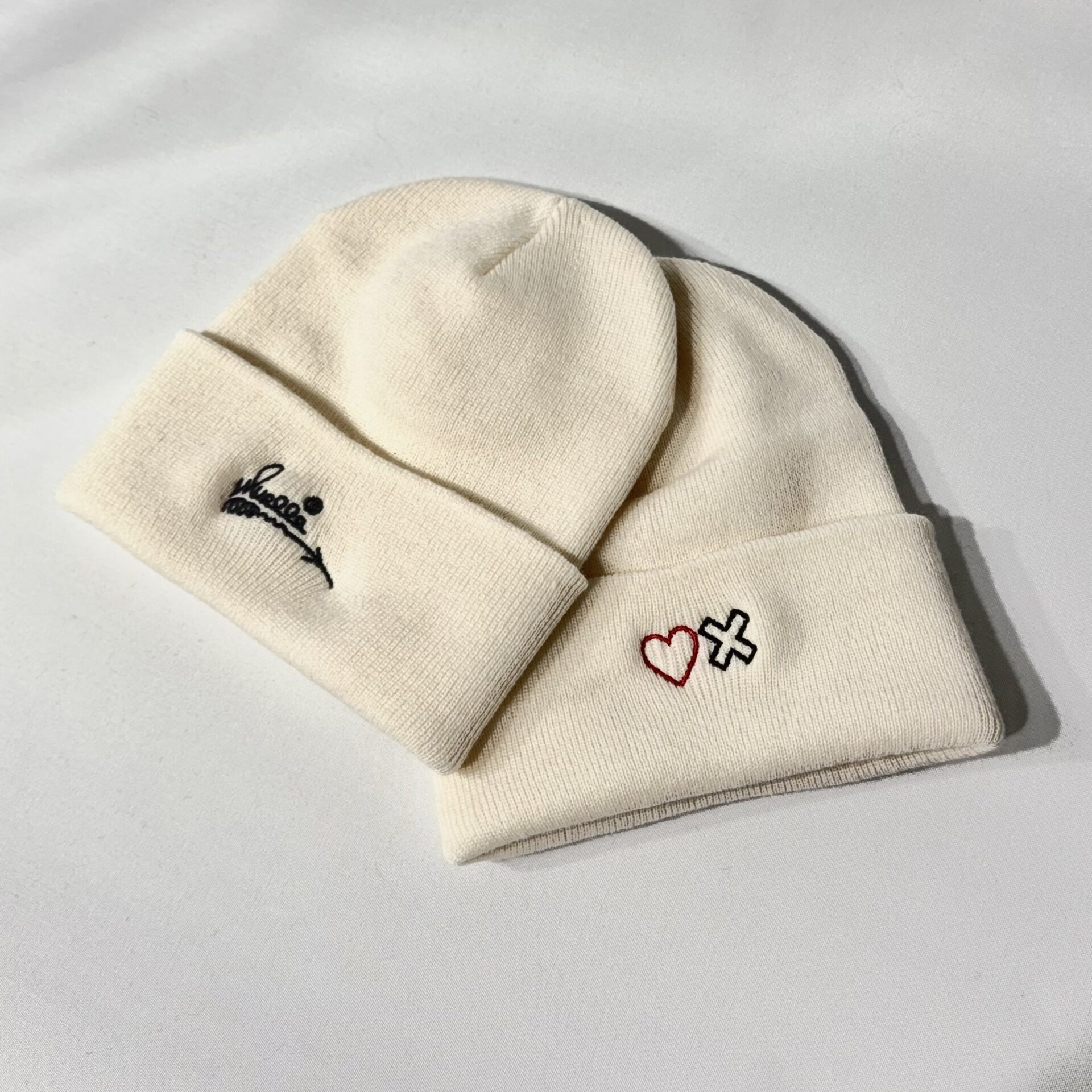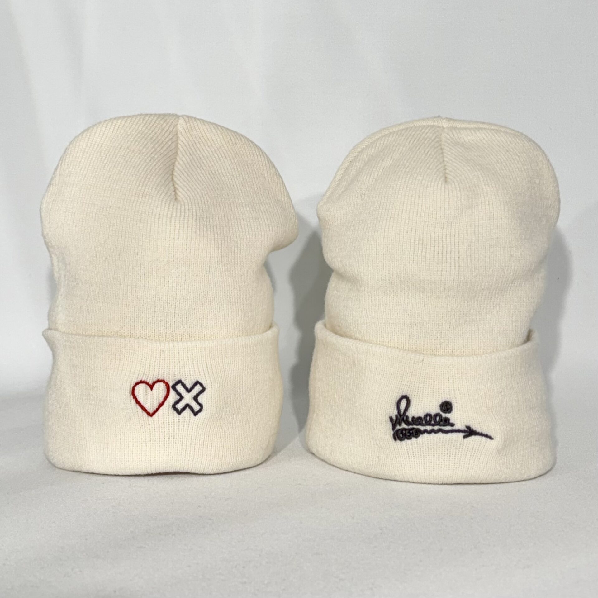 Gorro de punto con bordado delantero y trasero. Blanco roto.